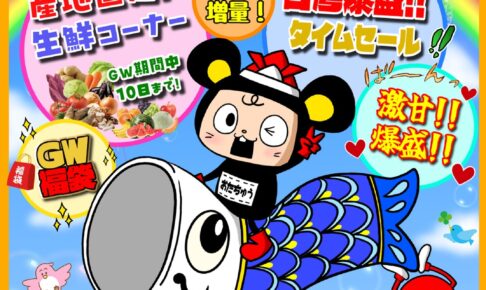 イベントGWは… ✨️特別‼️増量‼️激甘‼️爆盛‼️だぁー👍 ☆産地直送・生鮮食品コーナー🥬 ☆台湾キャッチャータイムセール🇹🇼 ☆ゴールデンウィーク福袋🥳 そして、なんと⁉️ 5/2(土)~5/6(水)の期間中…