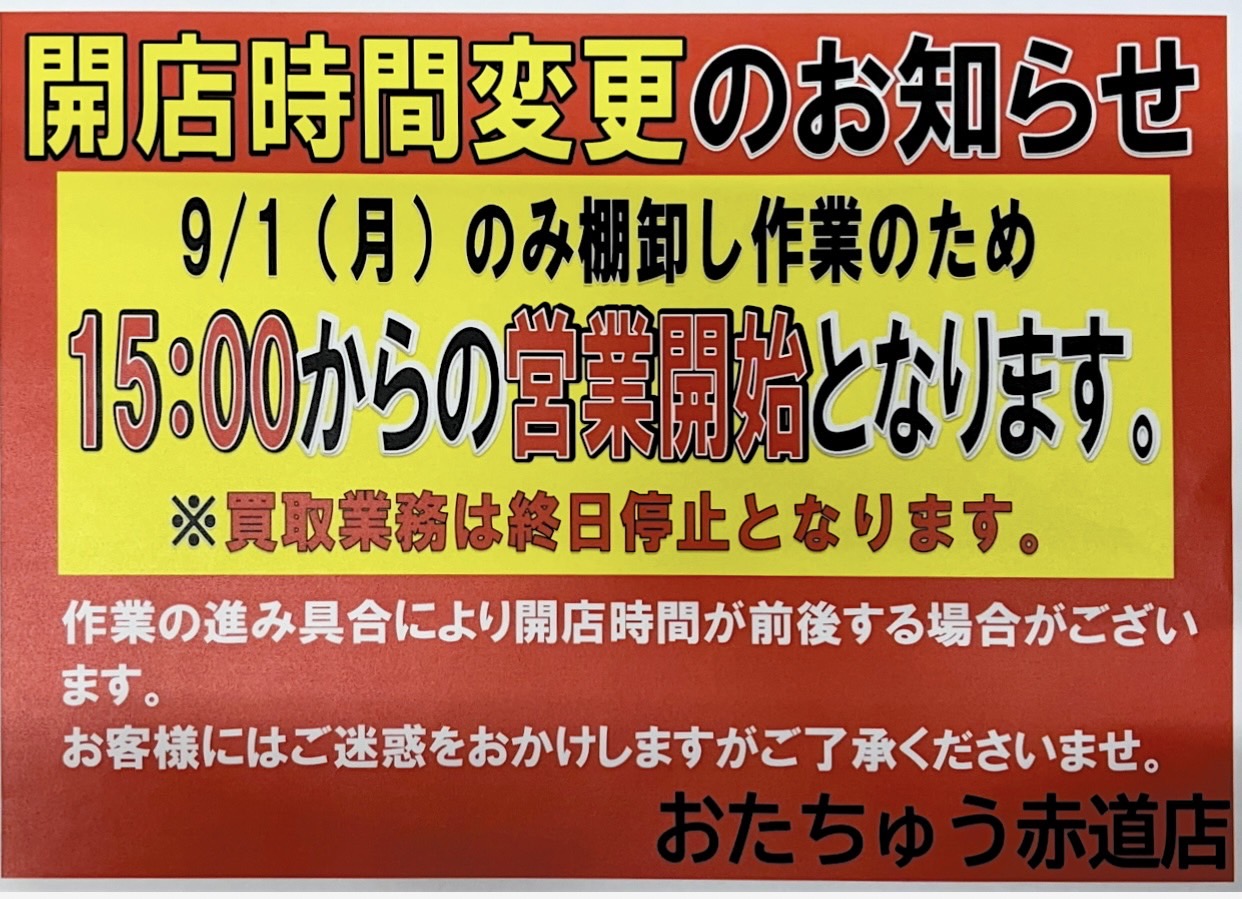 ★《10月20日より》買取受付時間変更に関してのお... ★買取受付時間変更に関してのお知らせ★ 日頃よりおたちゅう赤道店をご利用くださいまして誠にありがとうございます...
