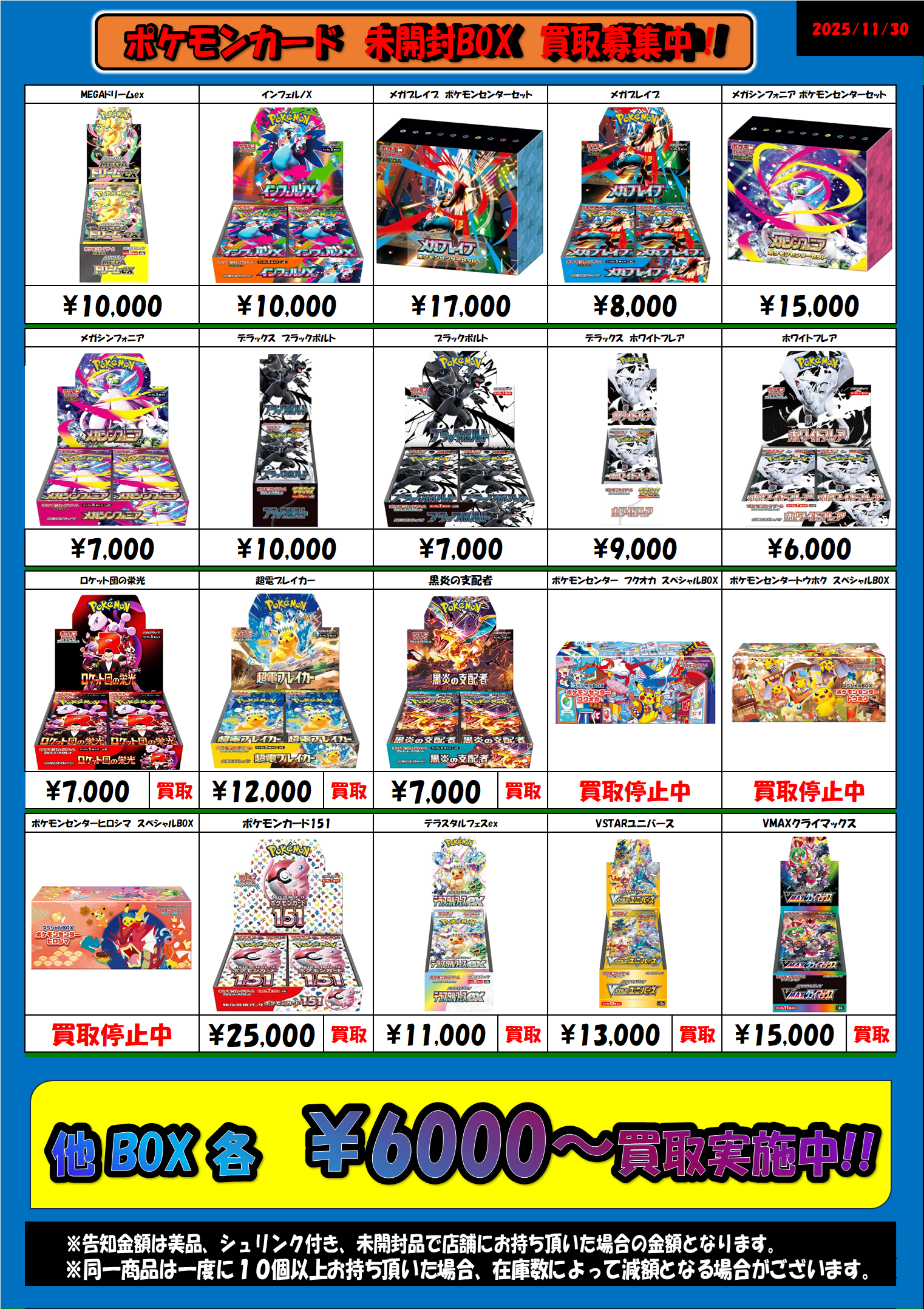 ポケモンカード未開封BOX最低買取実施中!! 2025年11月30日 集まり次第終了となりますのでお早めにお持ち下さい。 ※2025/11/30現在の価格となります。 在庫状況などによってお値段が変動いたします。予めご了承ください。 ************************ こちら↓もぜひチェックしてみてくださいね♪(*´▽`*) ・最新のイベント情報はこちら ・最新の買取情報はこちら