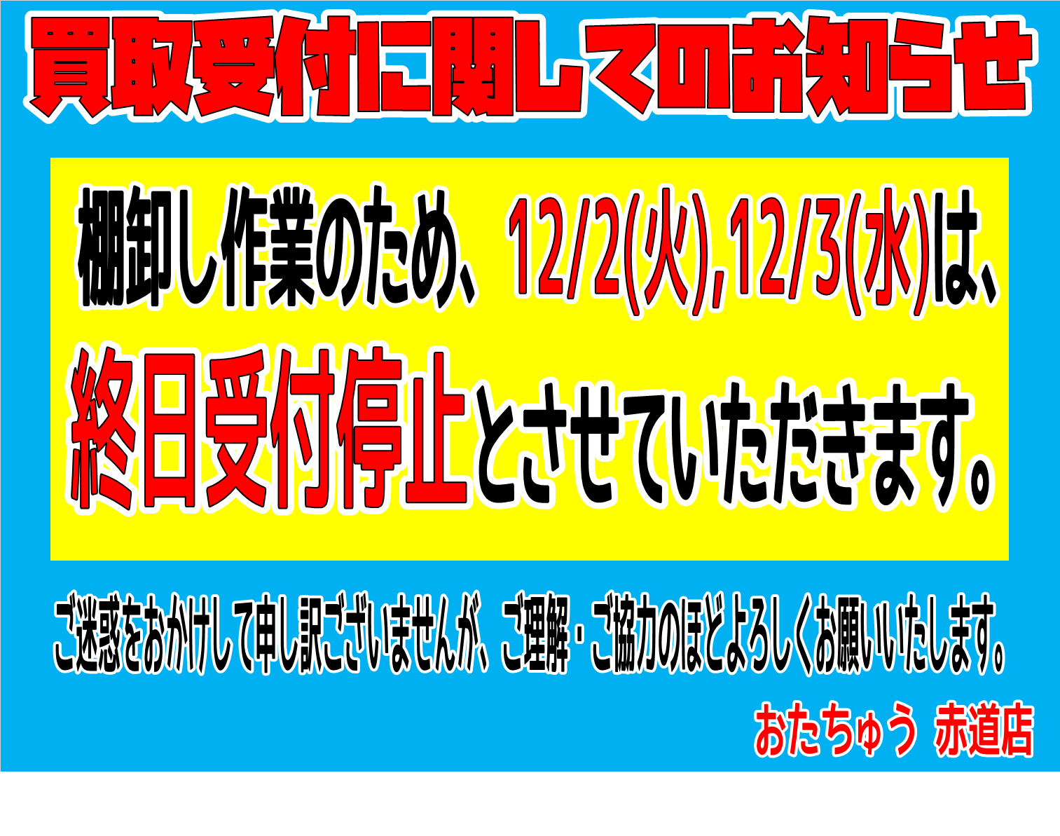 ★12/2(火),12/3(水)の買取受付停止のお知らせ★