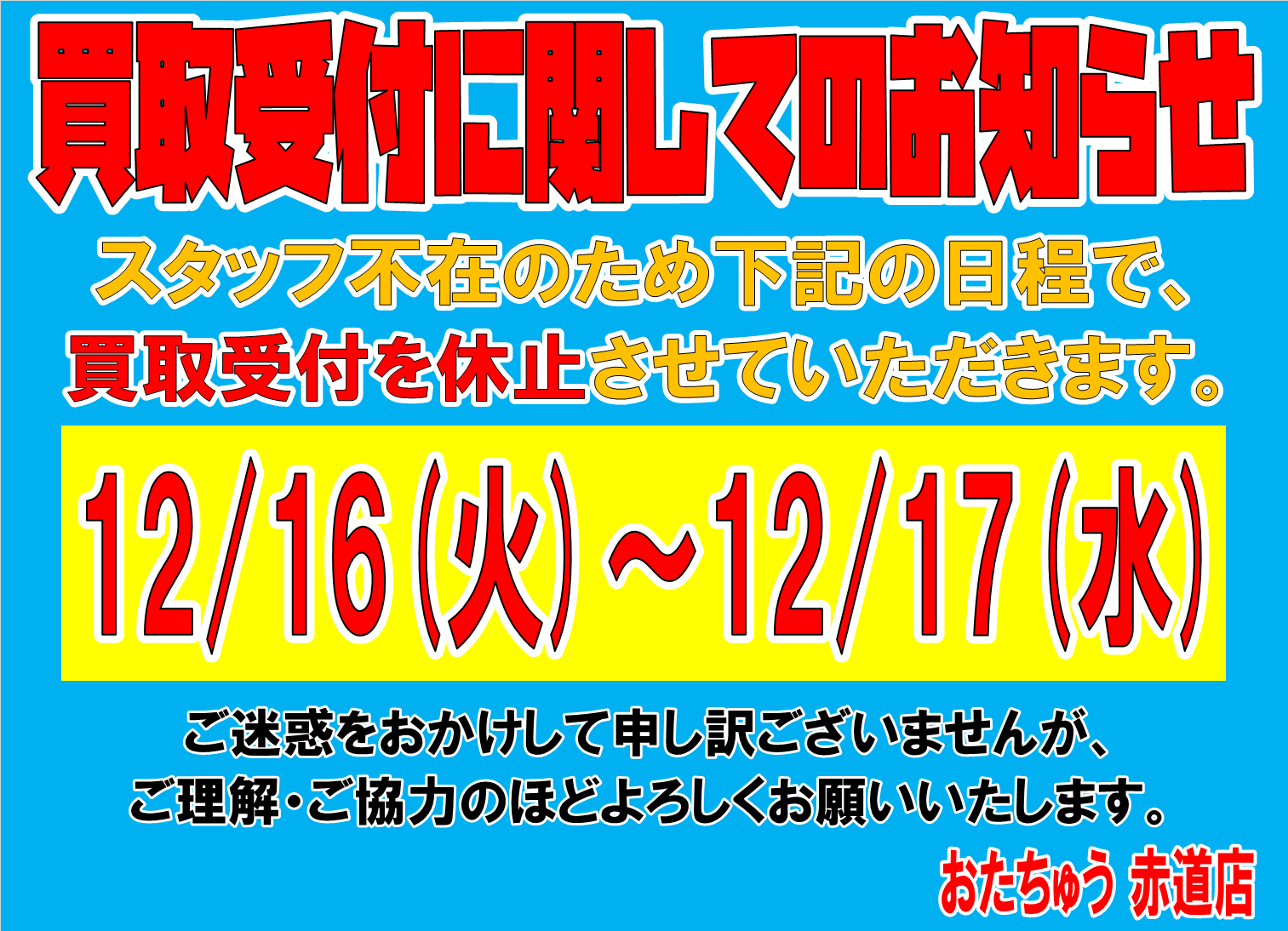 ★12/16(火)、12/17(水)の買取受付休止のお知らせ★