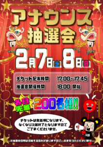 3/7(土)・3/8(日)開催予定のイベント中止の... この度、3月7日(土)、3月8日(日)に開催を予定しておりました『アナウンス抽選会』につきまして、諸事情により...