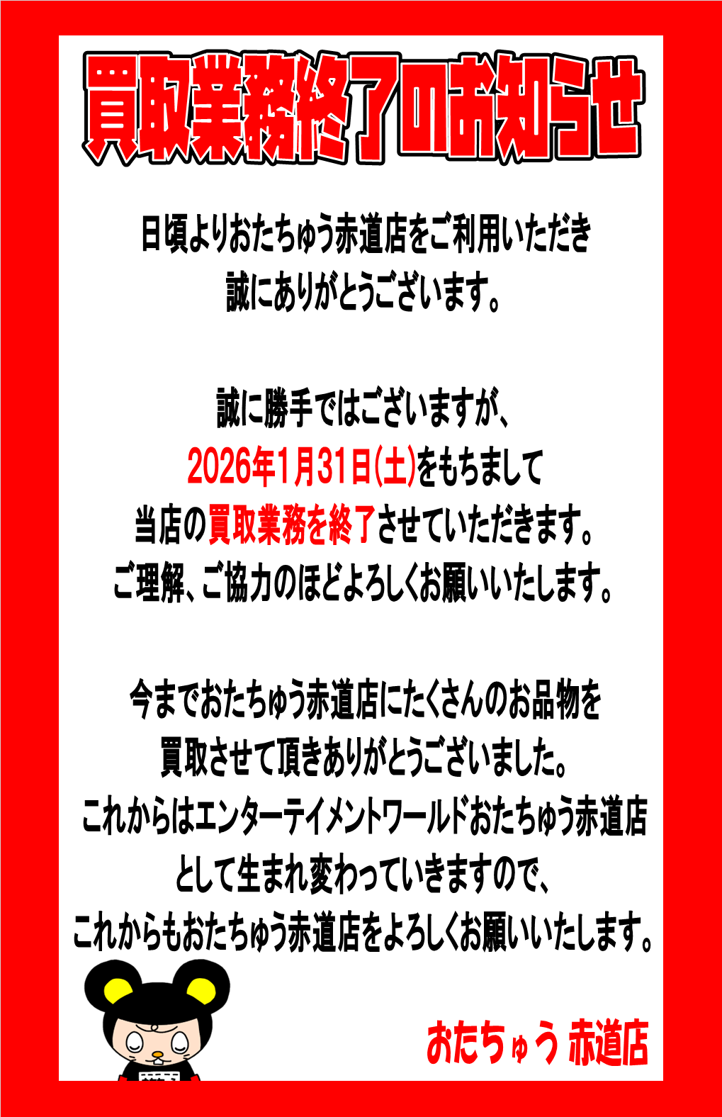 買取業務終了のお知らせ 赤道店の買取業務終了に関するお知らせです。 ご理解・ご協力のほどよろしくお願いいたします。