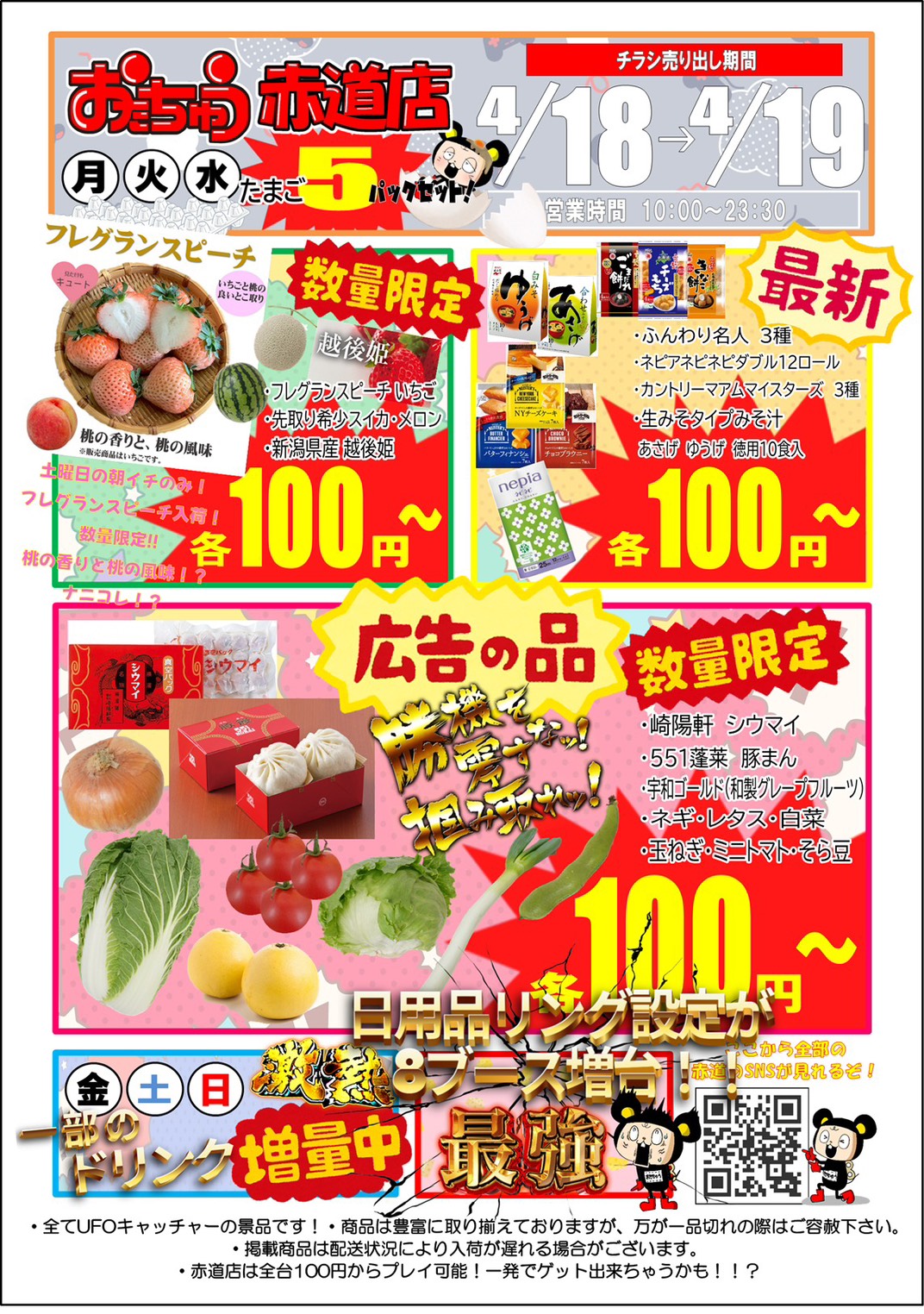 【4/18~4/19】赤道店の広告の品‼️ 2026年4月16日 今週の広告の品!! お待たせしました!!! 今週は桃の香りと風味がする(らしい)イチゴが入荷!!! フレグランスピーチだってさ!!!!それっぽい名前…!なんこれ… 土曜日の朝イチ数量限定だから売り切れ注意‼️ そして日用品のリング設定激増え!UFOキャッチャーやったことないお客様でも取れちゃうかも…! 主婦の味方、赤道店!生鮮食品爆増え🍓🍈🍅🥒🧅🥚 赤道だけで夜ご飯作れちゃうかも?! 毎週チラシUPするから楽しみにしててくれよな!!!!! 赤道店でお待ちしております!