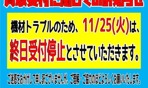 買取情報★買取受付時間変更に関してのお知らせ★ 日頃よりおたちゅう赤道店をご利用くださいまして誠にありがとうございます。 誠に勝手ではございますが、10/20(月)より買取受付時間を、下記の時間に変更させて頂きます。 ご迷惑をお…
