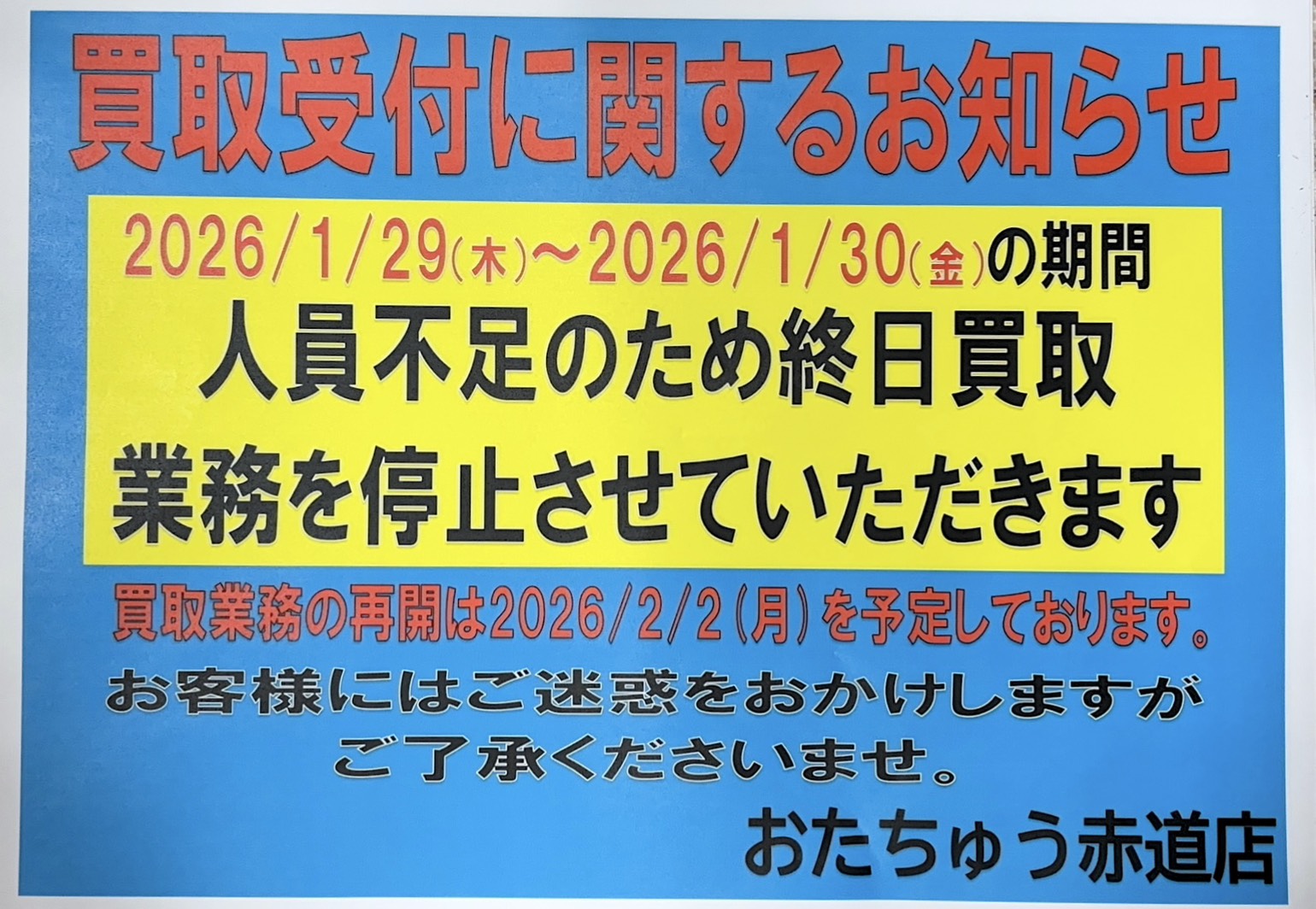 【重要】販売・買取業務終了のお知らせ【重要】 ★赤道店の販売・買取業務終了に関するお知らせ★ ご理解・ご協力のほどよろしくお願いいたします。