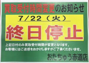 ★《10月20日より》買取受付時間変更に関してのお... ★買取受付時間変更に関してのお知らせ★ 日頃よりおたちゅう赤道店をご利用くださいまして誠にありがとうございます...